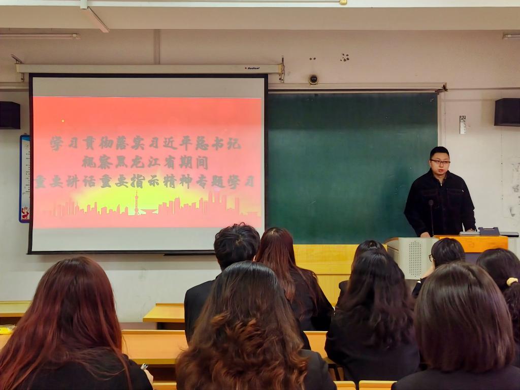 团委书记闵诗尧以《学习贯彻落实习近平总书记视察黑龙江省期间的重要讲话重要指示精神》为题,围绕“牢牢把握在国家发展大局中的战略定位”“走出一条高质量发展、可持续振兴的新路子”“在新时代新征程推进东北全面振兴中展现新气象、新作为”三方面带领大家深刻领会习近平总书记重要讲话和重要指示精神的深刻内涵及其实践要求。希望学生党员积极响应国家号召,投身创新创业,以更加昂扬的斗志、更加务实的作风,投身到推动东北全面振兴的伟大事业中,为振兴龙江贡献青春力量。