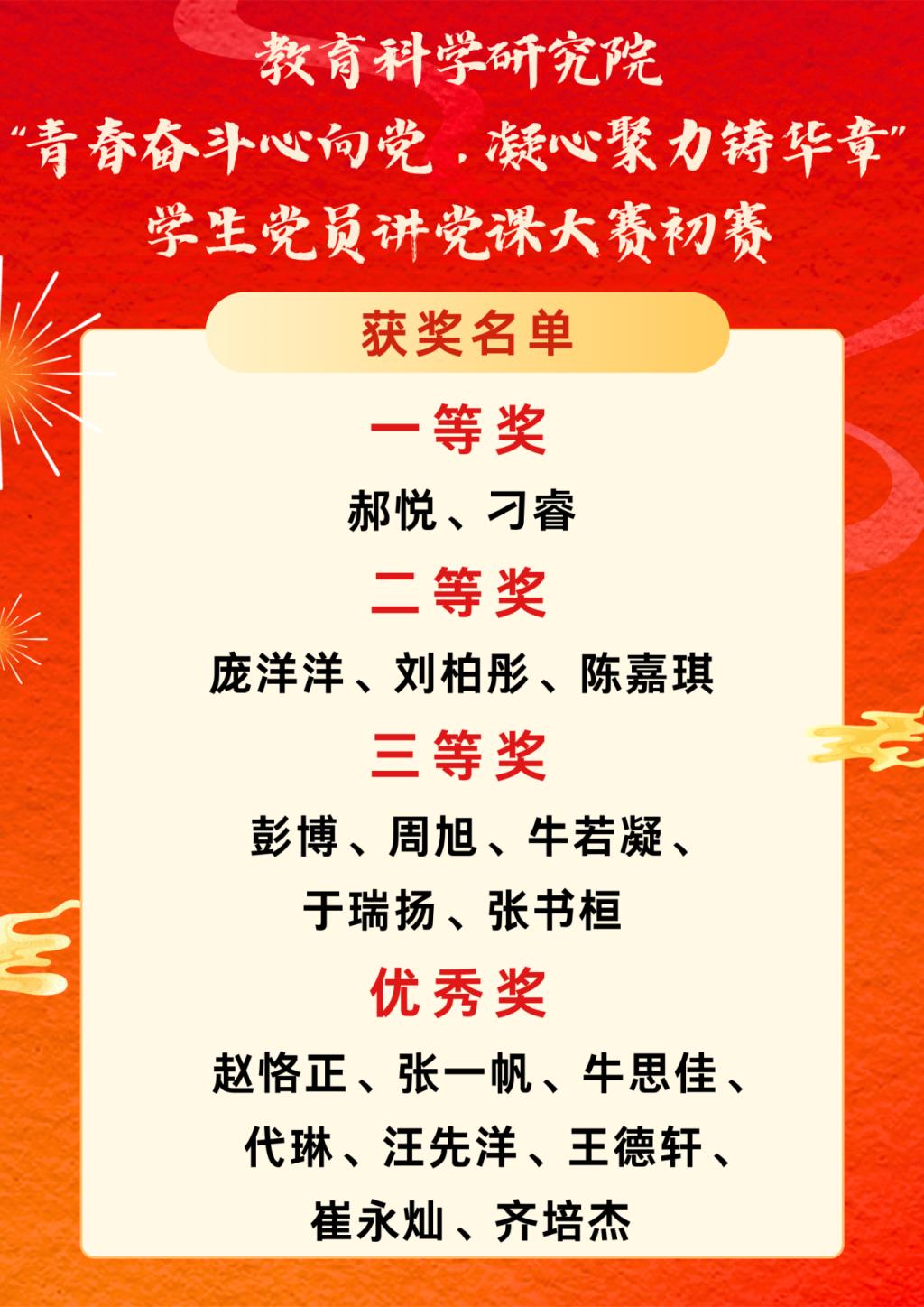 本次比赛充分展示了学生党员积极的精神面貌和深厚的爱国情怀。相信教育学子今后将会更加坚定理想信念,凝聚奋进力量,勇于担当时代赋予的历史使命,励志勤学、刻苦磨练,自觉学习践行党的二十大精神,以昂扬奋进的姿态书写无愧于时代的壮丽篇章,让青春在全面建设社会主义现代化国家的火热实践中绽放绚丽之花!(教育科学研究院供稿)