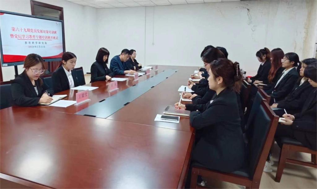 第六十九期党员发展对象培训班暨党纪学习教育专题培训班的通知》要求,教育科学研究院于5月31日17时30分,在汇文楼947会议室开展第六十九期党员发展对象培训班暨党纪学习教育专题培训班开班式。教育科学研究院党总支书记綦明霞、党总支副书记屈广宁、2021级学生党支部书记王馨莹、2023级学生党支部书记宋美琪出席,本期培训班全体学员参加,会议由每日大赛