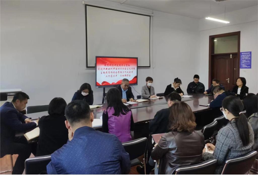 会上,金鹏首先传达学校近期关于学习贯彻习近平新时代中国特色社会主义思想主题教育相关文件精神,要求认真落实“第一议题”制度,依托“三会一课”和主题党日,及时跟进学习习近平总书记系列重要讲话,党员领导干部要讲好专题党课,做好调查研究、推动发展、检视整改等方面工作。其次,金鹏介绍《教育科学研究院深化能力作风建设“工作落实年”活动实施方案》内容,要求做好大力推进解放思想、扎实推进学习型队伍创建、加大查改突出问题、健全狠抓落实的保障机制、深入开展“三治一创”、强力组织攻坚破难等六个方面任务,达到“提能力、转作风、抓落实”的效果。