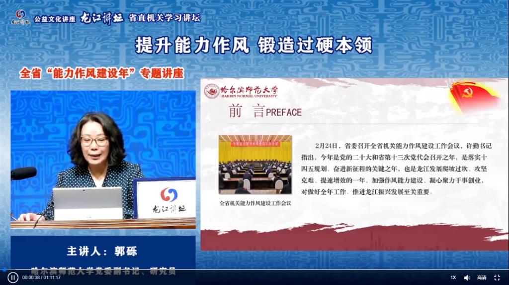 为深入学习贯彻习近平总书记关于能力作风建设的重要论述和对黑龙江省的重要指示,根据学校《关于组织收看“能力作风建设”专题讲座的通知》,教育科学研究院党总支于4月26日9时,组织全体党员教师收看“能力作风建设”专题讲座——《提升能力作风 锻造过硬本领》,本次讲座由哈尔滨师范大学党委副书记、研究员郭砾主讲。