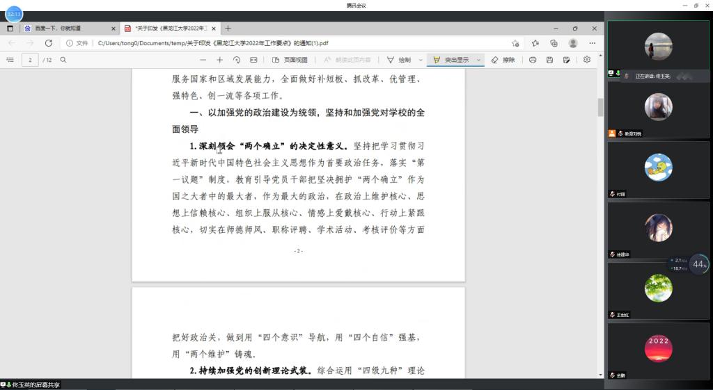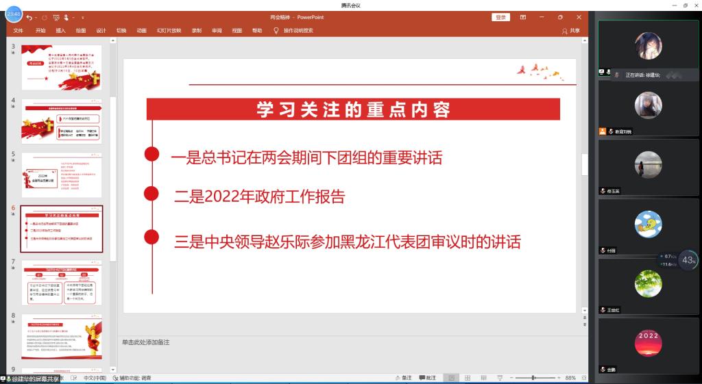 随后,教育行政党支部书记徐建华分享了《学习贯彻两会精神》。从全国两会的历史方位、主要议程进行简单概述,重点从习近平总书记在两会期间下团组的重要讲话、2022年政府工作报告、中央领导赵乐际参加黑龙江代表团审议时的讲话三个方面展开详细地讲解,促进与会成员对两会精神和政府工作报告有了更加系统全面的认识。