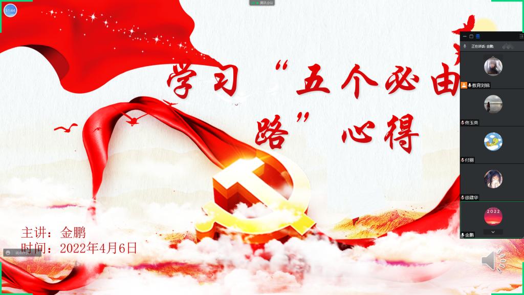 最后,党总支书记金鹏表示在《辉煌征程展宏图》2022年“两会”精神解读中,王向明教授从“两会”背景、未来工作的主要目标和高举旗帜向未来三个方面,围绕过去一年我国经济发展的成绩和2022年发展的主要预期目标进行详细解,让我们对国家的发展与强大有了更加深刻的认识。随后,金书记进行“五个必由之路”学习分享,从“五个必由之路”由来和主要内容、深刻认识“五个必由之路”、指明努力方向、坚定必由之路自信四个方面开展讲解。强调要深刻认识“五个必由之路”的指导性作用,这是习近平新时代中国特色社会主义思想的又一次丰富和发展,为我们奋进新征程、建功新时代指明了方向。