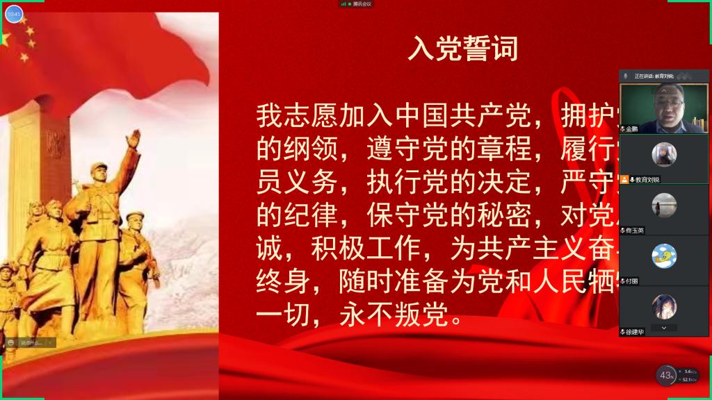 恰逢清明,在这个特殊的传统节日里,为追思英雄、缅怀先烈,会上首先进行网上祭英烈环节。组织员刘锐带领全体成员重温入党誓词,在云端向为国捐躯的先烈表达无尽的哀思。党总支书记金鹏表示党员要铭记和颂扬英雄先烈事迹,不忘初心,不负使命,坚定前行,勠力同心,为中华民族的伟大复兴作出应有的贡献。