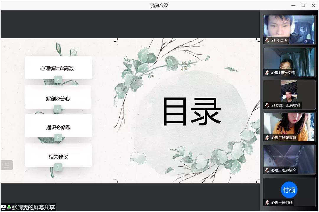 针对各科的考试题型,主讲人依据学习经验提出了复习的侧重点,传授了自己的做题技巧,总结各类题型的答题思路。张晴雯学姐建议同学们重视高等数学和心理统计及软件应用的基础公式,尽量先理解再背诵普通心理学和人体生理解剖的知识,做到有效复习。尚闯学长则带领大家回顾课本重要知识点,并建议同学们通过复述的形式来检测自己的背诵成果,加深记忆,提高复习效率。