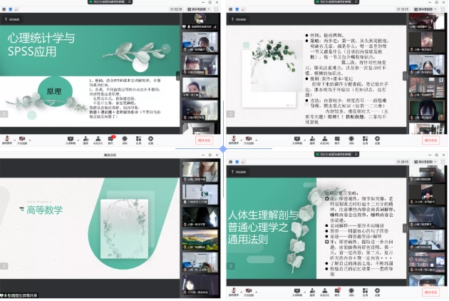 本次辅导活动以教育学和应用心理学两个专业进行,主讲人立足于课本,对教育通论、普通心理学、教育技术学、心理统计及软件应用、高等数学等10门课程进行辅导,循序渐进地帮助同学们建立系统的知识框架,梳理知识脉络,讲解各单元学习重点。