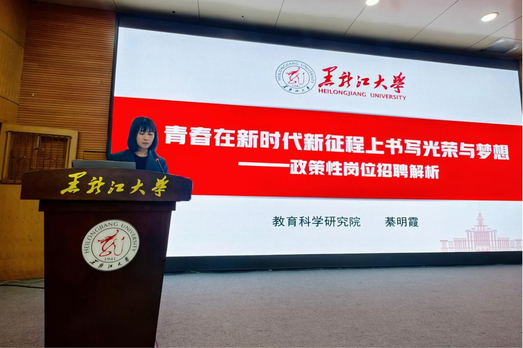 院党总支书记綦明霞老师对选调生、“三支一扶”“西部计划”等政策性岗位进行解读,详细介绍了政策性岗位有哪些,报考条件,获取信息渠道,选拔流程以及服务期满享有的优惠政策等方面。綦明霞书记指出党和政府高度重视高校毕业生就业工作,强调充分发挥政策性岗位吸纳作用,基层作为高校毕业生成长成才的重要平台,鼓励同学们到基层工作。同时她对2025届毕业生提出三点期望:一是希望大家做脚踏实地、持之以恒的人。保持平实之心,客观看待个人条件和社会需求,从实际出发选择职业和工作岗位,脚踏实地,在实践中一步步成长起来。二是希望大家做志存高远、砥砺奋进的人。只有坚持不懈地执行自己的计划,不断向着目标前进,才有成功的希望,才能实现美好的人生蓝图。三是希望大家做信念坚定、有家国情怀的人。每个毕业生都应该把个人选择与国家发展相融合,把“小我”融入“大我”,主动到基层去、到军营去、到西部去,到祖国最需要的每一个平凡的岗位去建功立业。