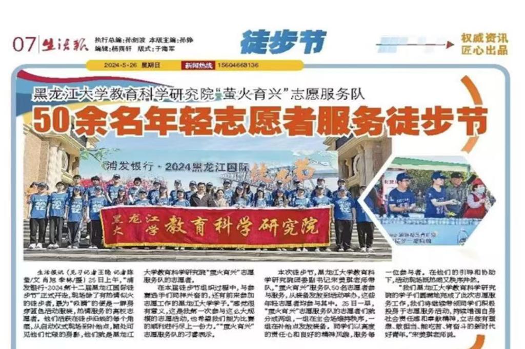 教育科学研究院“萤火育兴”志愿者助力浦发银行 · 2024第十二届黑龙江国际徒步节活动圆满完成,此次志愿服务工作被龙头新闻、生活报等媒体报道。
