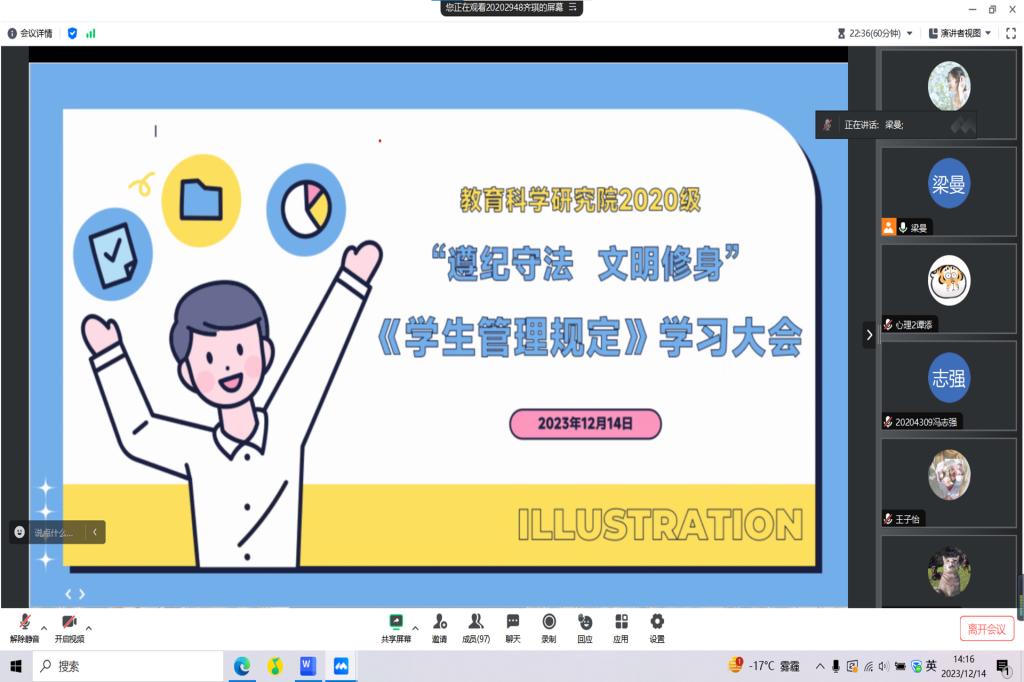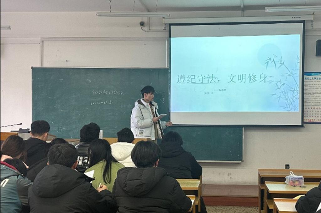以道德浸润心灵,以纪律规范行为。为进一步加强遵纪守法宣传教育,帮助我院学生熟悉掌握校规校纪,自觉规范在校行为,强化遵纪守法意识,营造良好班级氛围,教育科学研究院各年级于12月中旬分别开展以“遵纪守法 文明修身”为主题的班会。