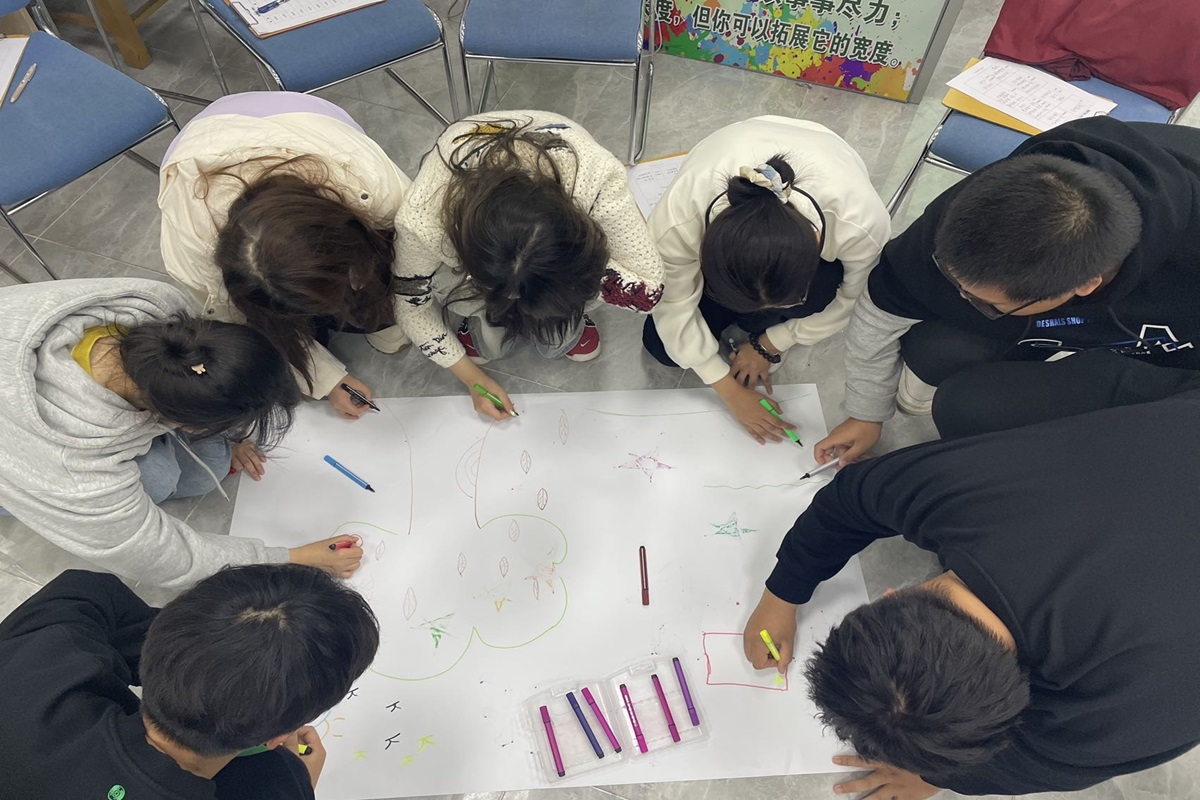 第二阶段“有幸成为一班”,同学们以小组为单位进行自我介绍和无声作画,互相了解小组成员的性格特点、兴趣爱好和未来目标等,并在无沟通的情况下,一幅幅有故事感的绘画作品拉近了同学们彼此的距离,促进了班级的凝聚力。