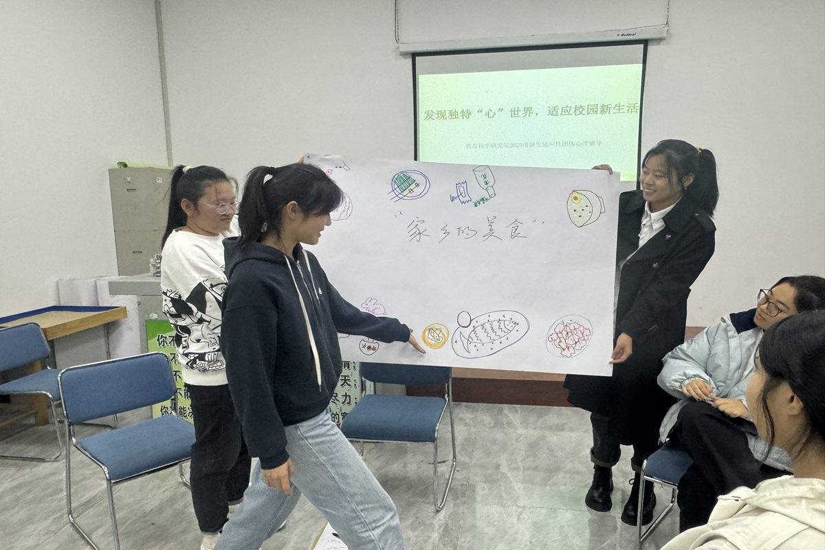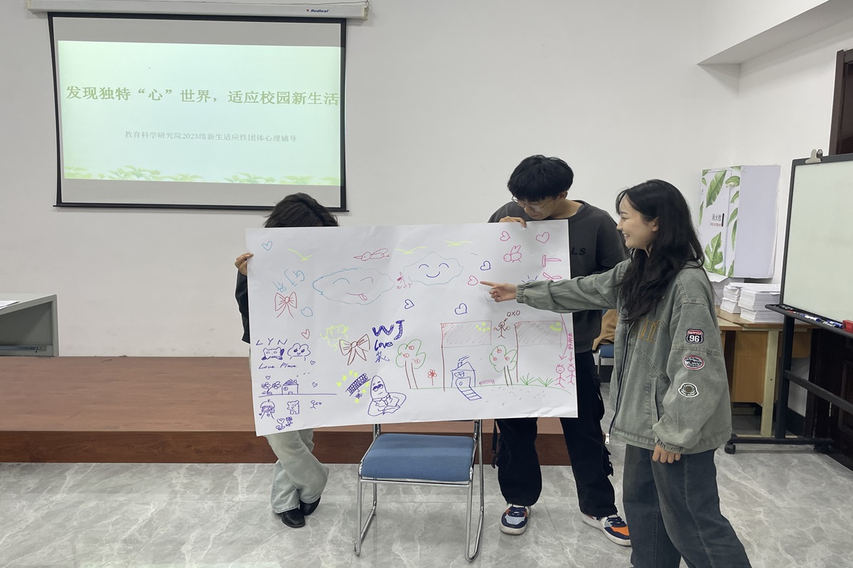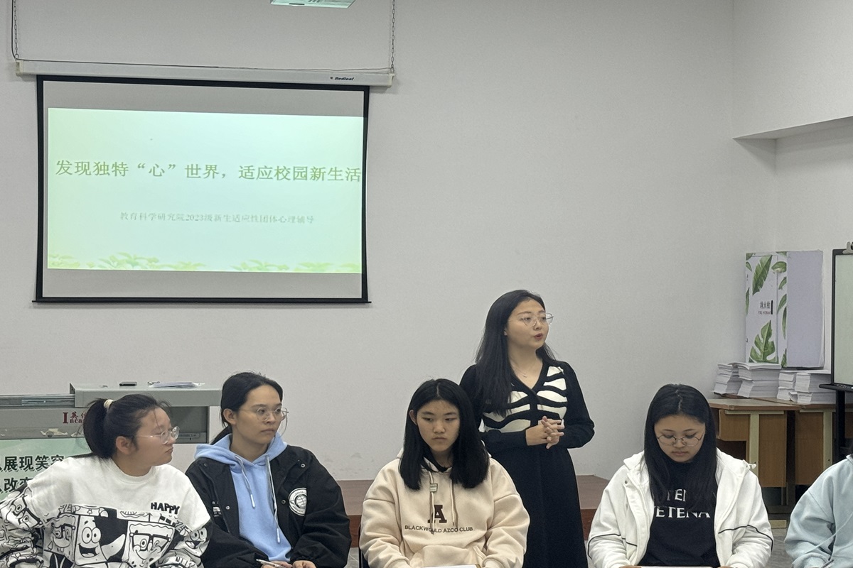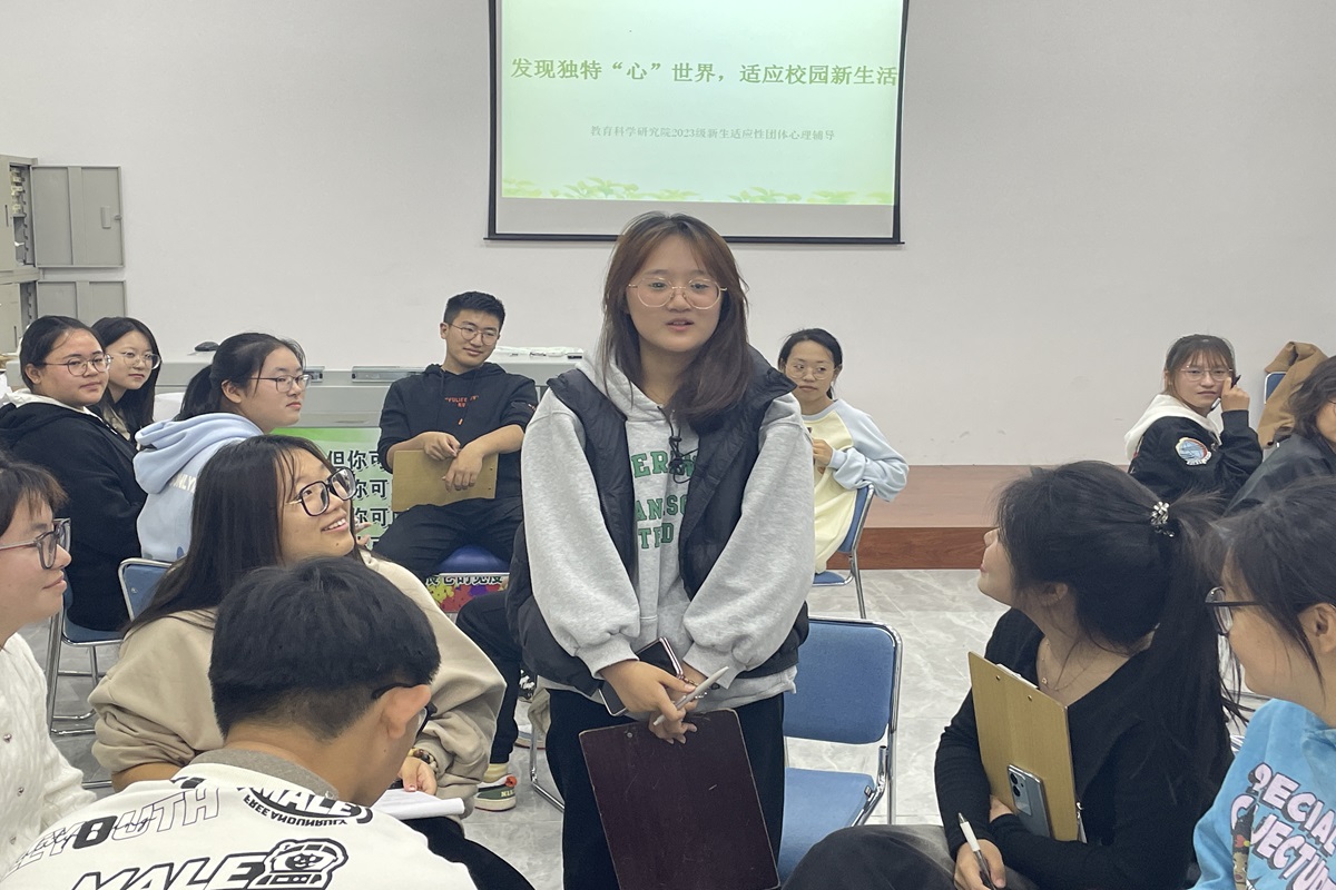 为培养大学生良好的心理素质,提升我院心理育人工作质量,促进大学生身心健康全面发展,教育科学研究院于2023年10月16日和23日在大学生活动中心430开展新生适应性团体心理辅导活动。本次活动由教育科学研究院2023级辅导员宋美琪老师主持,2023级新生班主任和院二级心理辅导站工作人员担任助理,2023级全体新生以班级为单位参加活动。