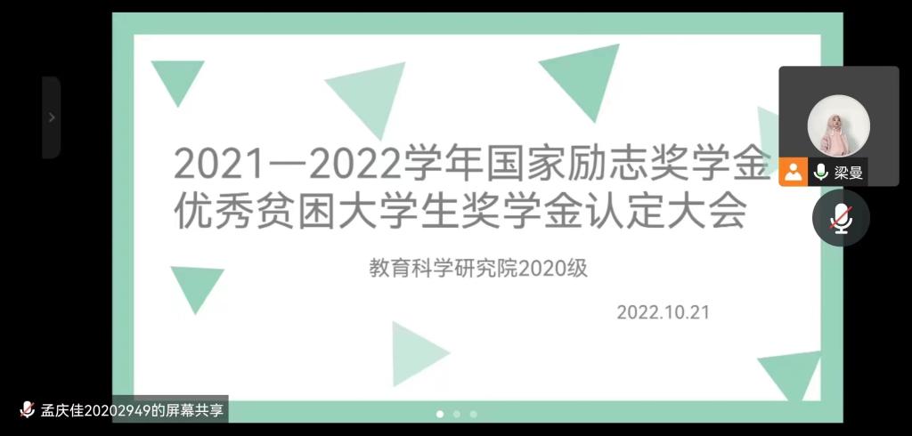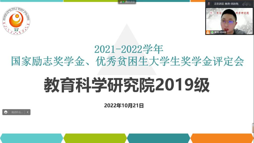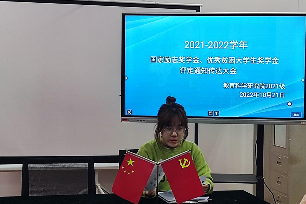 资助育人工作,保障学生得到有效的资助,根据学生工作部《关于评定2021-2022学年国家励志奖学金的通知》与《关于评定2021-2022学年优秀贫困大学生奖学金的通知》相关要求,教育科学研究院高度重视,成立以院党总支副书记为组长的认定工作领导小组,各年级于2022年10月21日组织召开国家励志奖学金、优秀贫困大学生奖学金评定会议,由2019-2021级辅导员主持,家庭经济困难学生参加会议。