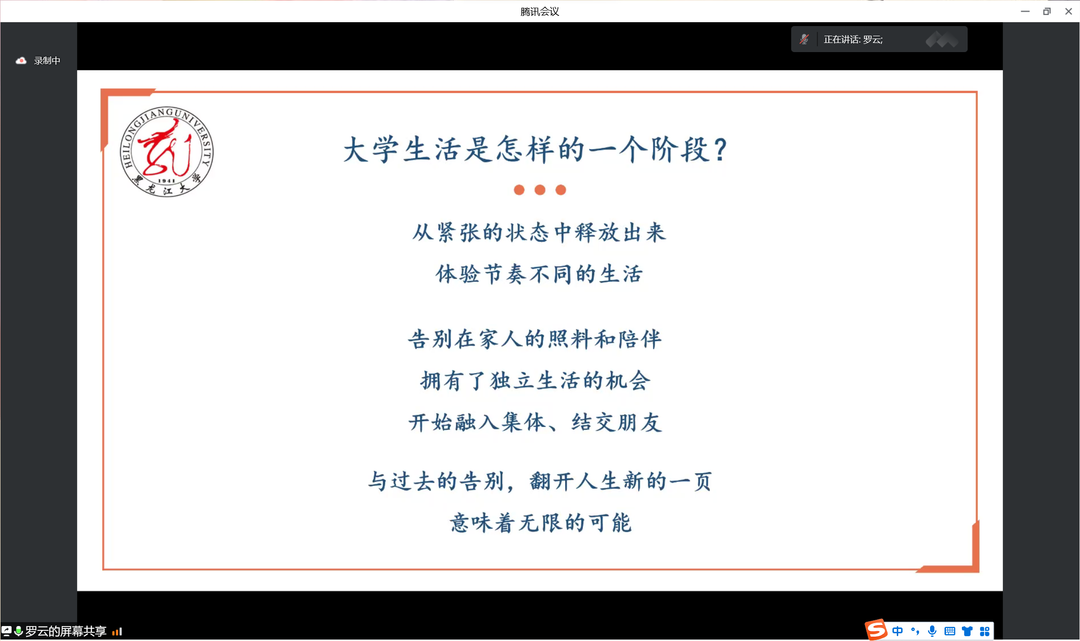 为帮助2022级新生更加深入地了解大学生活,设定预期目标,对大学生活有明确的规划,减少迷茫与不适应,使大学生活更加丰富多彩,教育科学研究院于2022年8月28日18时30分于腾讯会议召开新老生经验交流会,本次经验交流会由学生会学习部干事乔骞主持,优秀毕业生代表张坤、罗云,优秀在校生代表尚闯、赵淑豪四位同学受邀分享经验,2021级、2022级辅导员王馨莹老师,研究生兼职辅导员樊俐男老师以及2022级全体新生共同参加本次会议。