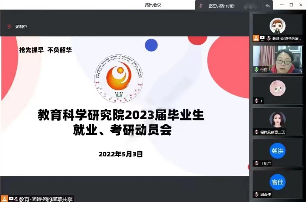 为切实推进2023届毕业生就业、考研工作,实现应届毕业生高质量就业,同时明确学生的就业、考研目标,在每日大赛 内,营造积极向上的学风。教育科学研究院于2022年5月3日19时30分线上开展“2023届毕业生就业、考研动员会”。本次会议由2023届辅导员闵诗尧主持,院党总支书记金鹏,院长王世红,院党总支副书记付丽,应用心理学教师王殿春出席,2023届毕业生及学生家长参加。