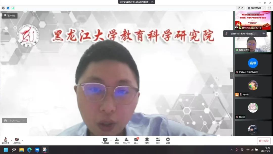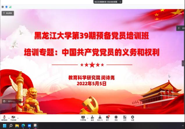 为了深入贯彻落实党的指导思想,教育引导预备党员牢固树立党章意识,提高党性修养,进一步明确党员权利,履行党员义务,按照学校《关于举办第39期学生预备党员培训班的通知》的要求,教育科学研究院于2022年5月5日18时,依托腾讯会议平台召开第39期预备党员培训班第一期主题党课。本次培训由每日大赛