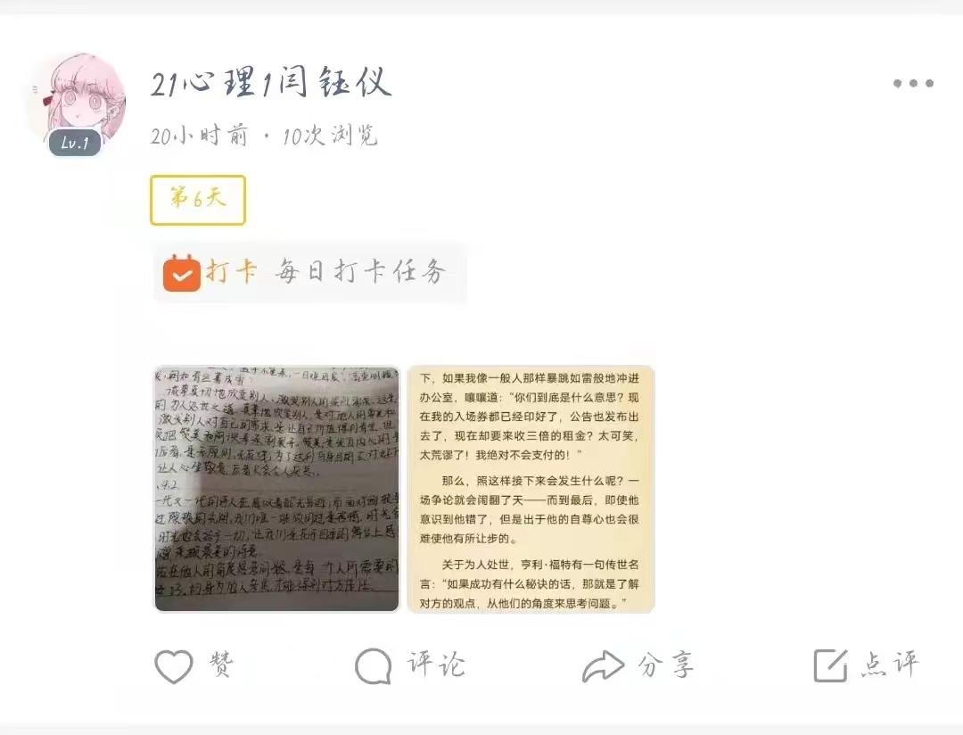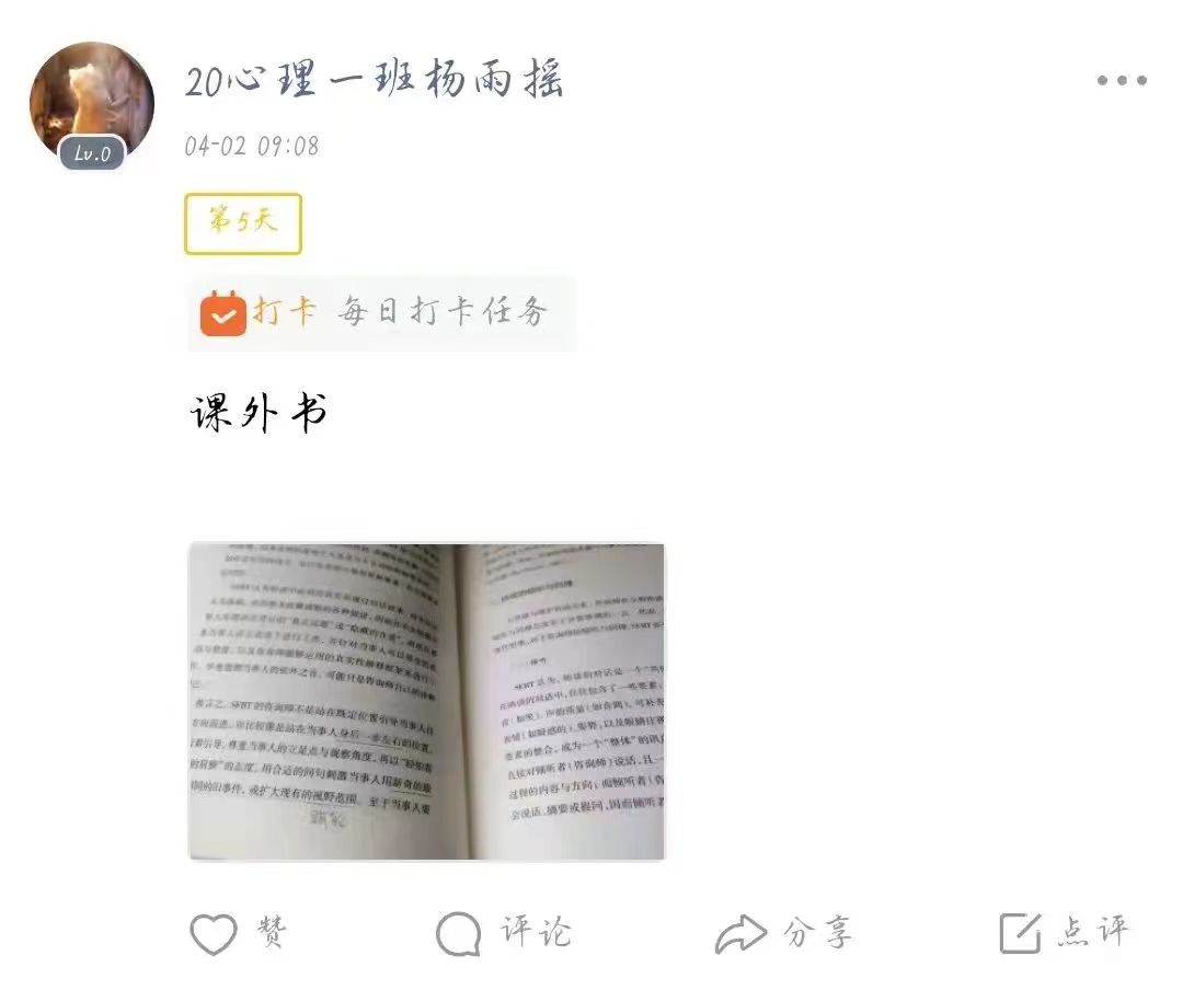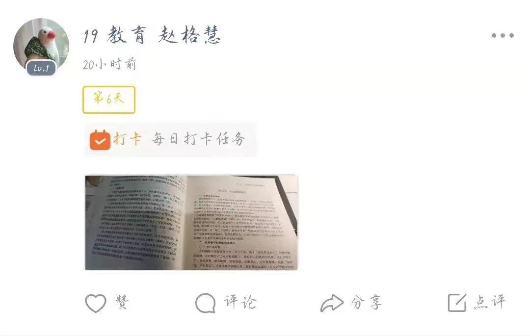 读书不觉已春深,一寸光阴一寸金。一本书,一支笔,在心中勾画一个书中的世界。“一本书像一艘船,带领我们从狭隘的地方,驶向生活的无限广阔的海洋”,在我们追求真理的道路上,因为有书籍与我们为伴,所以我们并不孤独。为鼓励同学们好读书,读好书,教育科学研究院开展“诗书勤乃有,不勤腹空虚”读书打卡活动。让我们一起来看看本次活动的成果吧
