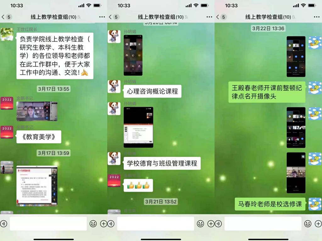 网课期间,为了解课堂授课情况、检验学生听课情况,成立线上教学领导组,由院领导班子、系主任、督导,教务员轮流进行线上听课,保证每节课都有人听课,听教师上课状态,查学生出勤,查学生听课效果,每日大赛