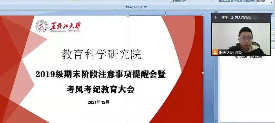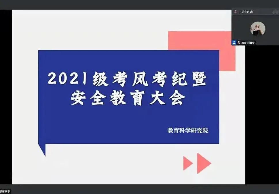 为推动近期考试的顺利进行,结合疫情防控工作的有关要求,2021年12月7日教育科学研究院于腾讯会议平台举行考风考纪教育暨安全教育大会。本次会议由2018级,2019级辅导员闵诗尧,2020级辅导员梁曼,2021级辅导员王馨莹分别主持,全体同学参会。