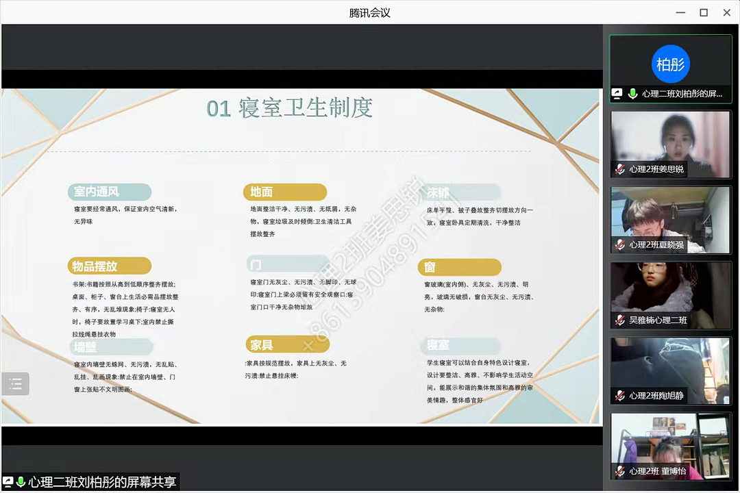紧接着,生活委员对安全教育问题进行普及。一是卫生安全问题,包括:寝室卫生制度,新冠疫情防护与冬季常见疾病防控。二是国家安全问题,带领同学们学习国家安全内容、相关法律以及日常防范措施。三是网络安全及消防安全问题,通过一些真实案例以及相关的新闻报道使同学们更加重视网络言论管理以及与同学们生命安全、财产安全息息相关的问题。