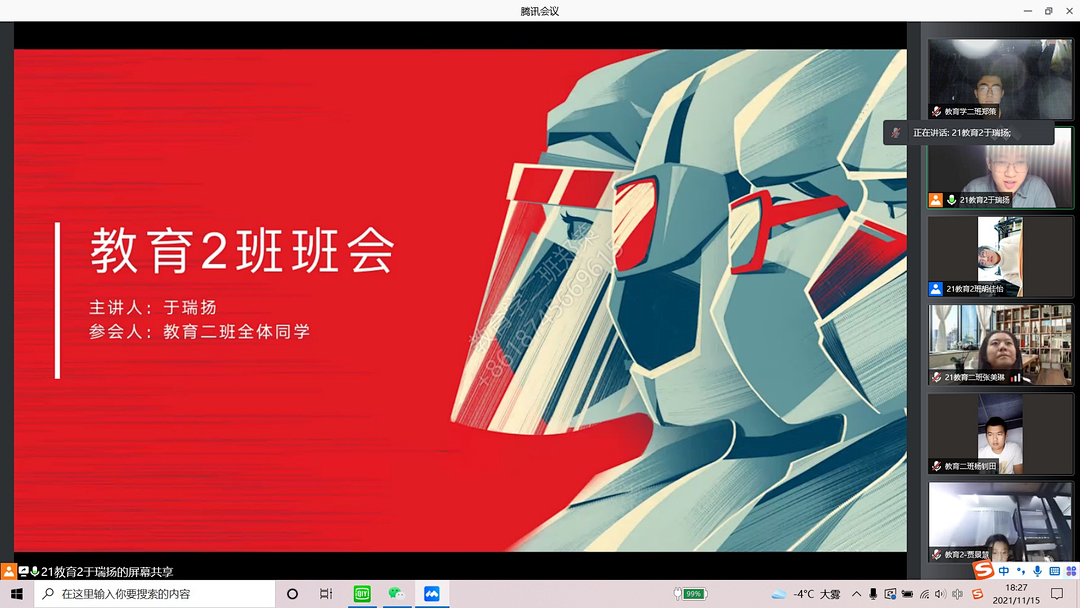 为了进一步帮助2021级新生更加科学地规划大学生活,明确学习目的并树立奋斗目标,2021年11月15日18时30分教育科学研究院于腾讯会议平台召开第二次班会,班会由2021级各班班长主持,各班班长、生活委员、学习委员主讲。本次班会共分为三个部分,分别为集体学习《每日大赛