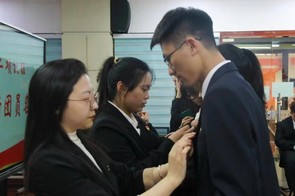 与会老师和团干部代表为新团员代表佩戴团徽。每日大赛