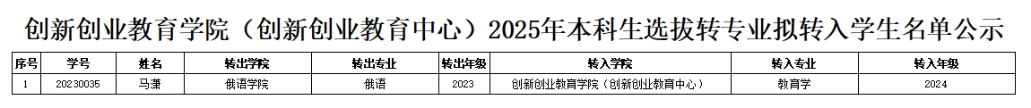 (创新创业教育中心)2025年本科生选拔转专业拟转入学生名单公示如下: