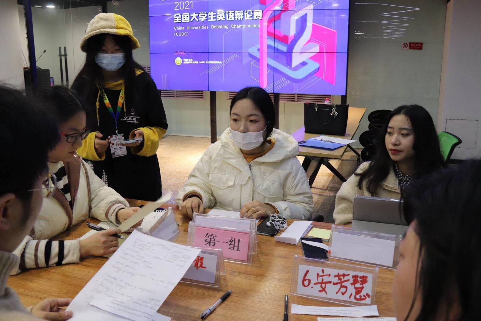 本次复赛以无领导小组讨论的形式开展,为了更加全面的考核选手开展了两轮无领导小组讨论,选手全程以英语进行交流,。赛前通过抽选议题的形式确定了6组选手的分组,议题包含了时事政治、热点话题等诸多领域,每轮讨论之前选手只有15分钟的临场准备时间。